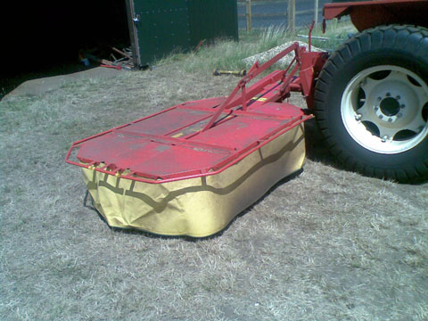 Samez 1.85M twin drum hay mower. This is quite a slow unit but is sufficient for our needs with three blades per drum. This is a good mower but does take quite a lot of manual effort to set up. We purchased this item back in 2004.